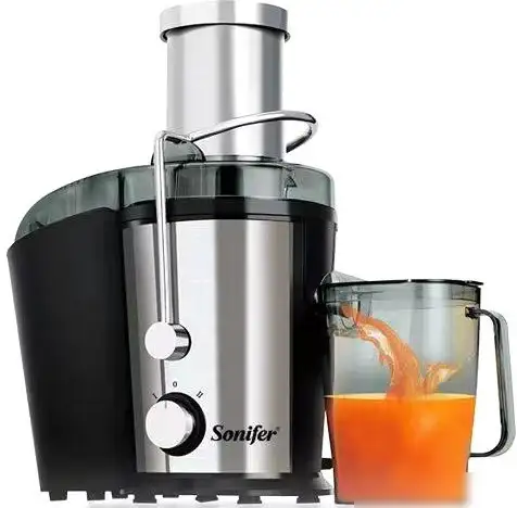 Соковыжималка Sonifer SF-5527 произведена в Китае и предназначена для быстрого и простого отжима сока. Она работает на мощности 800 Вт, что обеспечивает хорошую эффективность работы. Конструкция основана на центробежном принципе, а материал корпуса – металл и пластик, что делает ее прочной и долговечной. В соковыжималке есть возможность регулировки скорости в двух режимах, а также блокировка для безопасного использования. Диаметр загрузочного отверстия составляет 85 мм, что позволяет вставлять целые фрукты и овощи, а емкость для сока – 1.1 литра. Также есть контейнер для отходов объемом 2 литра и функция отброса мякоти.