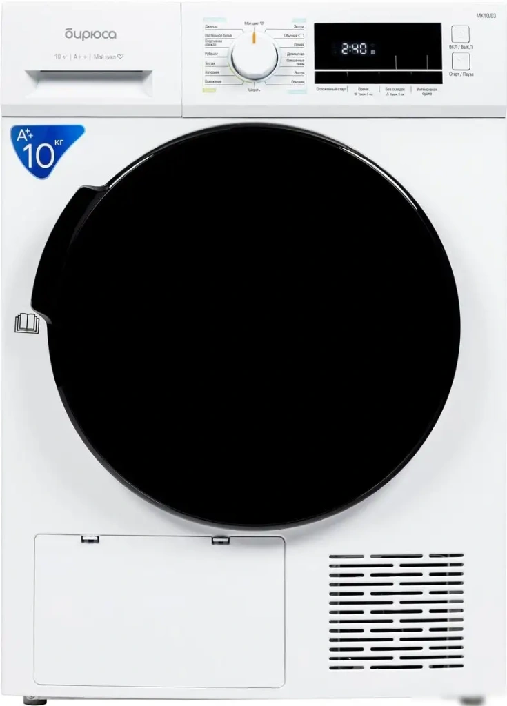 Сушильная машина Бирюса DM-MK10/03 изготовлена в Китае и работает по принципу конденсационной сушки с тепловым насосом. Она отдельно стоящая и имеет цвет корпуса — белый, а панель управления — черную. Машина вмещает до 10 кг белья за один цикл и оснащена 16 программами для各种 тканей, включая хлопок, синтетику, шерсть и деликатные вещи. Объем барабана составляет 125 литров, и есть подсветка для удобства загрузки и выгрузки. Особенности включают подставки для обуви и шерстяных изделий, контроль влажности и легкую глажку без складок. Управление осуществляется через электронный интерфейс с цифровой индикацией, есть звуковой сигнал и блокировка от детей. Машина работает тихо, уровень шума при сушке — 65 дБ, что делает её комфортной для дома. Также есть функция отложенного старта и индикация ошибок для удобства эксплуатации.
