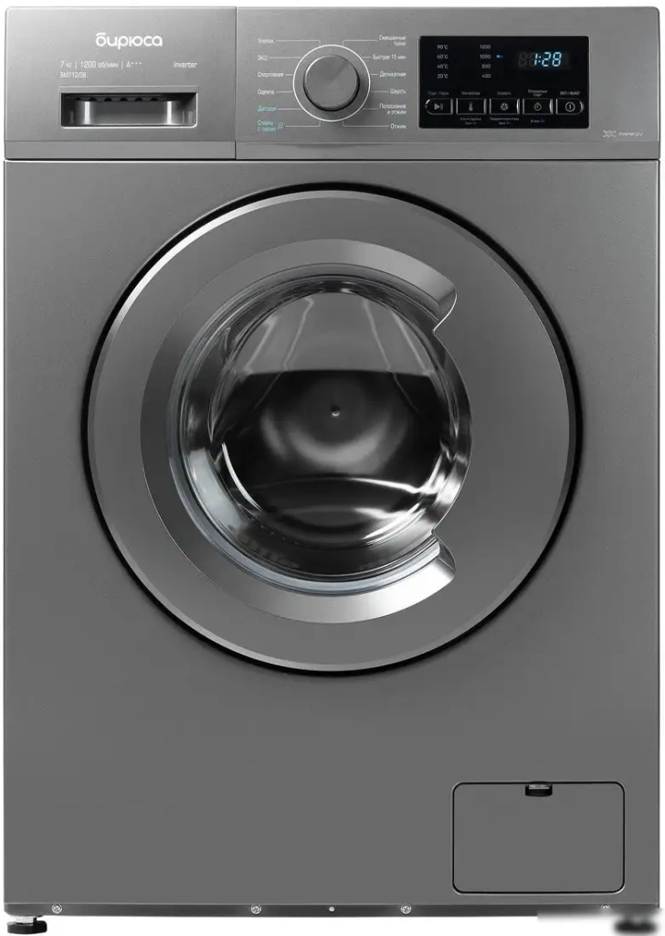Стиральная машина Бирюса WM-SM712/08 M — это отдельностоящее устройство с загрузкой до 7 кг и скоростью отжима 1200 об/мин. Она выполнена в серебристом цвете с черной панелью управления и не имеет люка с правой петлей. Благодаря классу энергопотребления A++, она экономит электроэнергию, а класс стирки A и отжима B обеспечивают хорошее качество. Машина предлагает 12 программ, включая быструю за 15 минут, деликатное и паровое стирки, а также стирку шерсти и спортивной одежды. Она работает с уровнем шума 60 дБ при стирке и 76 дБ при отжиме, что удобно для домашнего использования. Управление осуществляется с помощью цифровой панели и есть функции блокировки детей, таймера задержки старта и индикации ошибок. Особенностью является обработка паром, которая помогает устранить складки. Машина не оснащена предварительным нагревом воды или автоматической дозировкой средства, но имеет функцию самоочистки. Благодаря инверторной технологии, она работает тихо и эффективно.