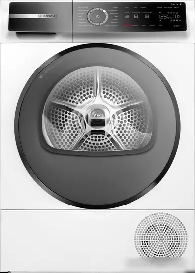 Сушильная машина Bosch Serie 8 WQB245ALSN помогает быстро и аккуратно высушить до 9 кг одежды. Она работает по технологии конденсации с тепловым насосом, что делает её очень энергоэффективной класса A+++. Машина имеет 14 программ, включая стандартные для хлопка, деликатных тканей и спортивной одежды, а также специальные функции, такие как уменьшение морщин и разглаживание складок. Объем барабана 112 литров обеспечивает простор для большой загрузки, а подсветка помогает легко загружать и выгружать бельё. Устройство контролирует влажность и автоматически останавливает сушку, чтобы сохранить качество одежды. Есть удобный ЖК-экран и функция задержки старта до 24 часов. Машина работает тихо — уровень шума при сушке составляет всего 61 дБ. Также есть блокировка от детей и звуковой сигнал о завершении работы. Высокое качество и простота в использовании делают её хорошим выбором для дома.