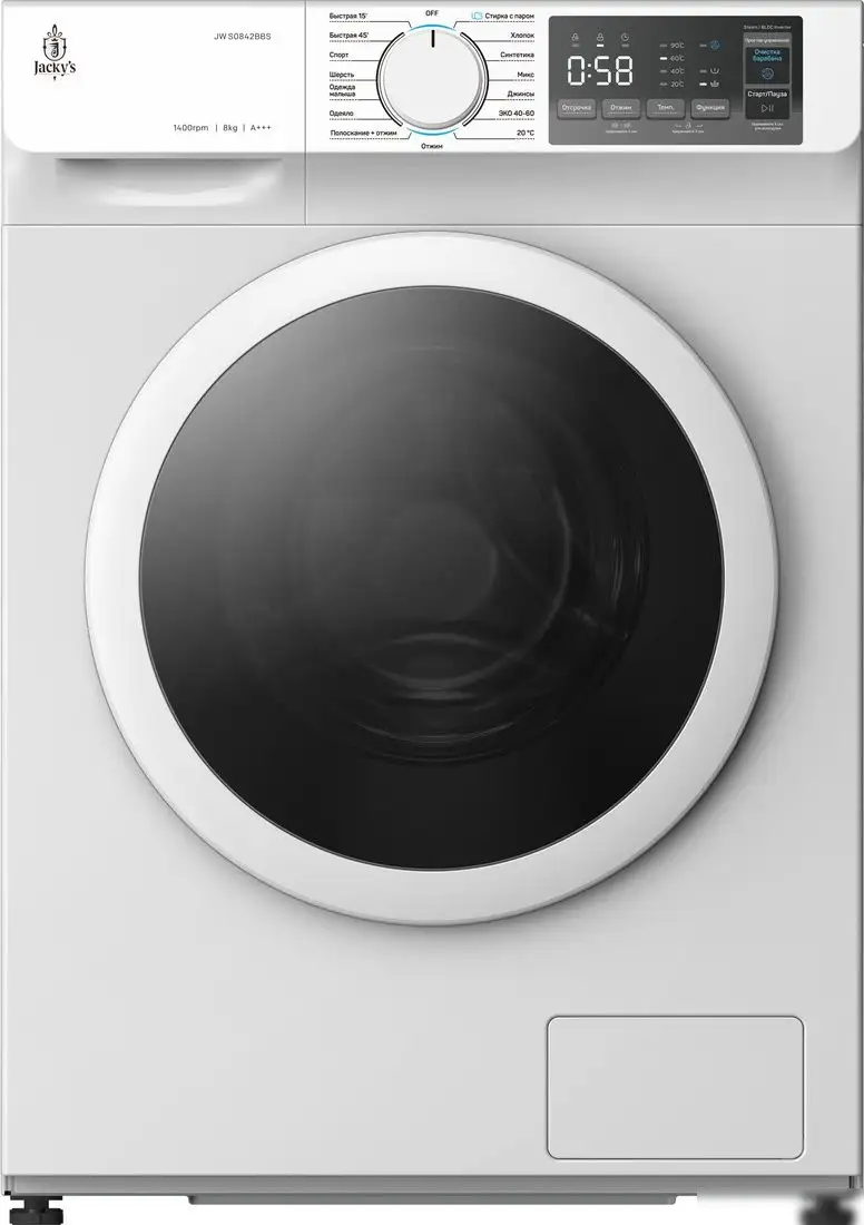 Стиральная машина Jacky's JW S0842BBS — это отдельностоящая модель белого цвета с электронным управлением и дисплеем. Она позволяет стирать до 8 кг одежды за один цикл, а её максимальная скорость отжима — 1400 об/мин, что обеспечивает быструю и качественную сушку. В машине есть 15 программ, включая быструю стирку за 15 минут, а также специальные функции для деликатных тканей и обработки паром. Машина имеет класс энергопотребления A+++ и использует инверторную технологию, что помогает экономить электроэнергию и воду. Благодаря автоматической дозировке моющего средства и режиму самоочистки, использование становится удобным и понятным. Также доступны такие полезные функции, как таймер отложенного старта и блокировка от детей.