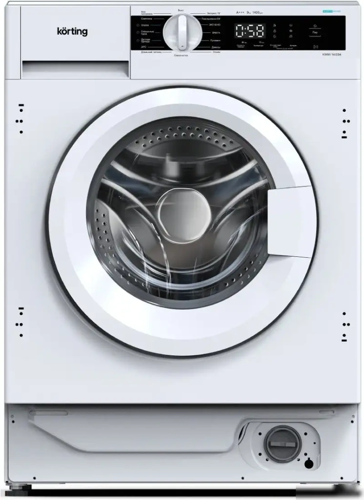 Стиральная машина Korting KWMI 14IS94 — встраиваемое устройство с белым корпусом и черной панелью управления. Она предназначена для загрузки до 9 кг белья и работает с максимальной скоростью отжима 1400 об/мин. Машина имеет 15 программ, включая деликатные и специальные режимы для шерсти, пуховиков и детской одежды. Она оснащена функциями паровой обработки и режимом экономии времени, что помогает лучше ухаживать за вещами и экономить ресурсы. Встроенная система автоматической дозировки и функция самоочистки упрощают эксплуатацию. Имеется четкая электронная индикация, таймер отсрочки запуска на 24 часа и блокировка от детей для безопасности. Машина работает тихо — уровень шума при стирке 56 дБ, при отжиме 78 дБ. Инверторный мотор обеспечивает энергоэффективность и надежность. Устройство удобно управляется через электронное управление и подходит для ниш высотой 83 см. Разработана для тех, кто ищет надежную и мощную встраиваемую стиральную машину.