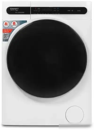 Китайская стиральная машина Kraft TCH-HD8528SW — это отдельностоящее устройство с белым корпусом и черной панелью управления. Она рассчитана на загрузку до 8 кг белья и быстро справляется с такими программами, как хлопок, деликатная и шерстяная стирка, а также обработка паром. Благодаря уровню шума в 62 дБ при стирке и 76 дБ при отжиме, вы не будете мешать себе и окружающим. Машина имеет функцию самоочистки и однородные программы, что облегчает уход за ней и делает использование проще. Встроенные функции включают блокировку для защиты детей, таймер отсроченного запуска и цифровую индикацию. Электронное управление помогает выбирать нужные параметры, а класс энергопотребления A+++ снижает расходы на электроэнергию. Устройство не использует прямой привод и не подключается к горячему водоснабжению, однако в комплекте есть шланг Aquastop для исключения протечек. Габариты составляют 60 см в ширину, 84.7 см в высоту и 52 см с люком, а вес — 60 кг. Эта модель подойдет для тех, кто ищет надежную и энергоэффективную стиральную машину с богатым набором функций.