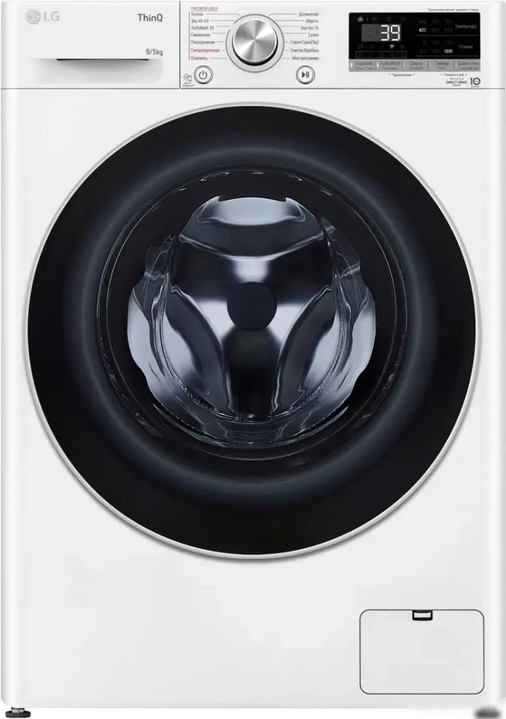 отдельностоящая, стирально-сушильная машина, с паром, загрузка до 9 кг, отжим 1200 об/мин, глубина 43.5 см (с люком 47.5 см), энергопотребление (new) A, прямой привод, 14 программ, AI DD (LG)/TurboWash 360 (LG)