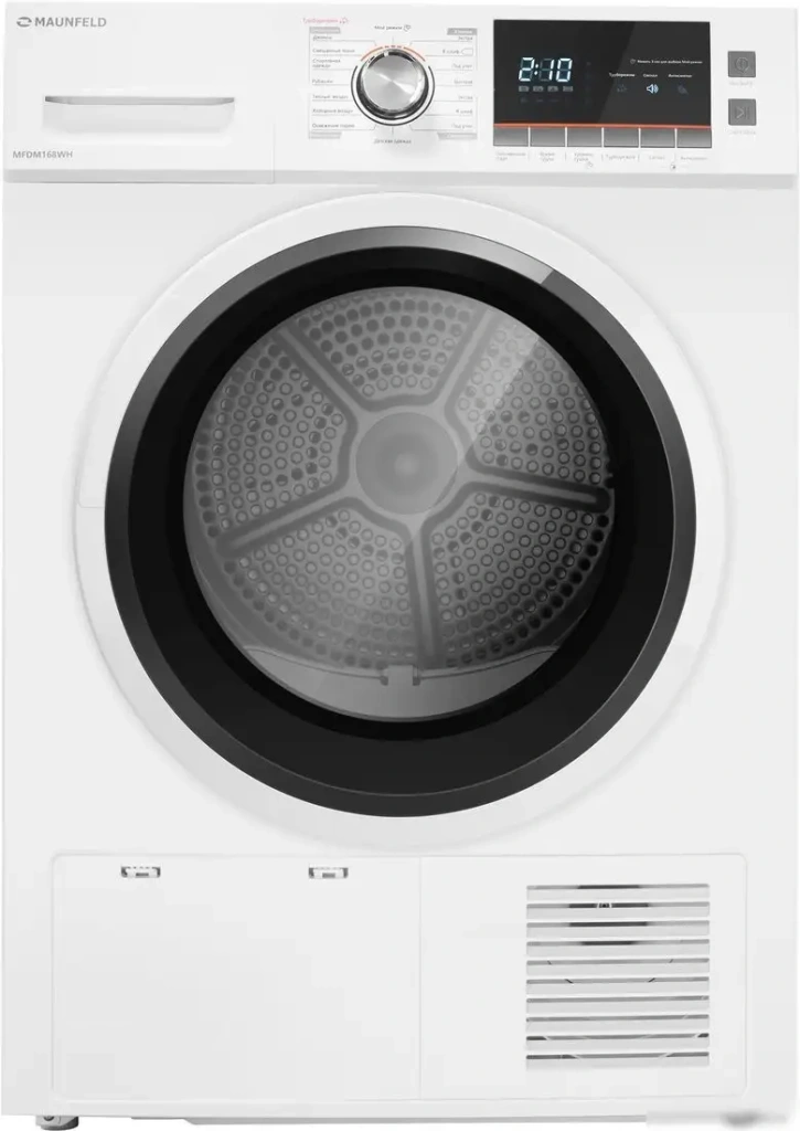 Сушильная машина MAUNFELD MFDM168WH легко сушит до 8 кг белья благодаря естественной конденсации. Она работает тихо — уровень шума составляет всего 69 дБ, что делает её более комфортной в использовании. Машина оснащена 15 программами, включая быстрый режим, обработку паром и специальные программы для детской одежды и спортивных костюмов. Подсветка барабана помогает удобно загружать и разгружать вещи. Интуитивное электронное управление и цифровая индикация делают работу с устройством простой. Встроенная функция экономии времени позволяет ускорить сушку при необходимости. Вы можете установить таймер отложенного старта на 24 часа и блокировать управление для безопасности. Это устройство удобно в использовании и хорошо подходит для разных видов тканей.