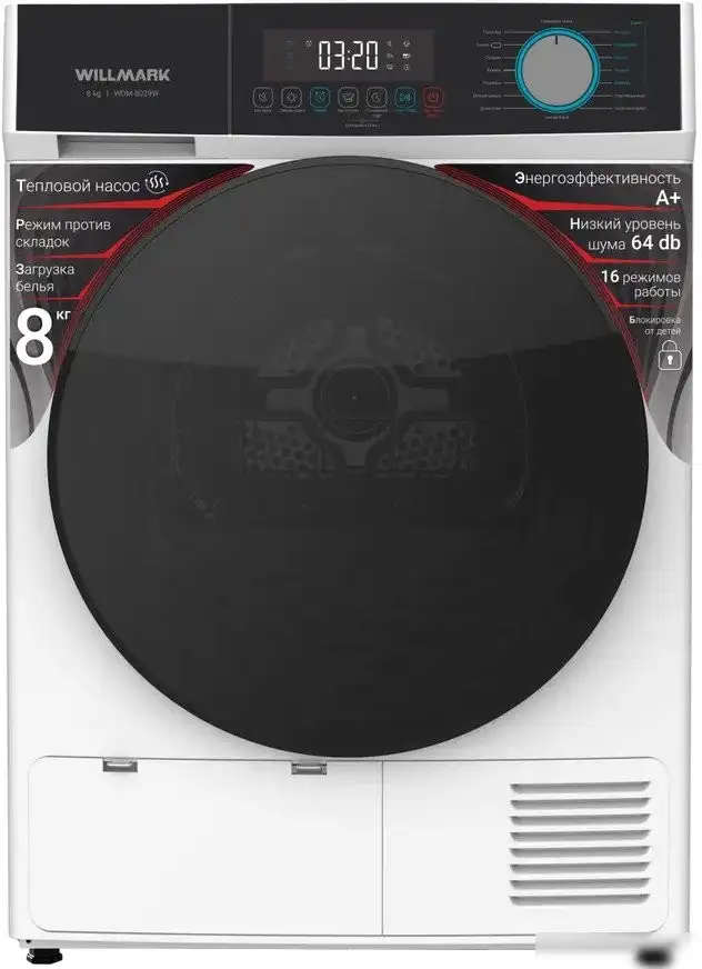 Сушильная машина Willmark WDM-8029W отлично подходит для дома. Она работает по методу конденсационной сушки с тепловым насосом, что помогает экономить энергию. Устройство отдельно стоит и удобно управляется с помощью электронного дисплея. Максимальная загрузка составляет 8 кг, что позволяет сушить большое количество вещей за раз. Машина имеет 16 программ, включая деликатные и спортивные вещи, постельное бельё и шерсть. Барабан объемом 117 литров обеспечивает бережную сушку без повреждений. Уровень шума при работе равен 64 дБ, он не мешает в квартире. Есть функции контроля влажности и индикация ошибок, что упрощает пользование. Также устройство блокируется для защиты детей и имеет таймер отложенного старта.