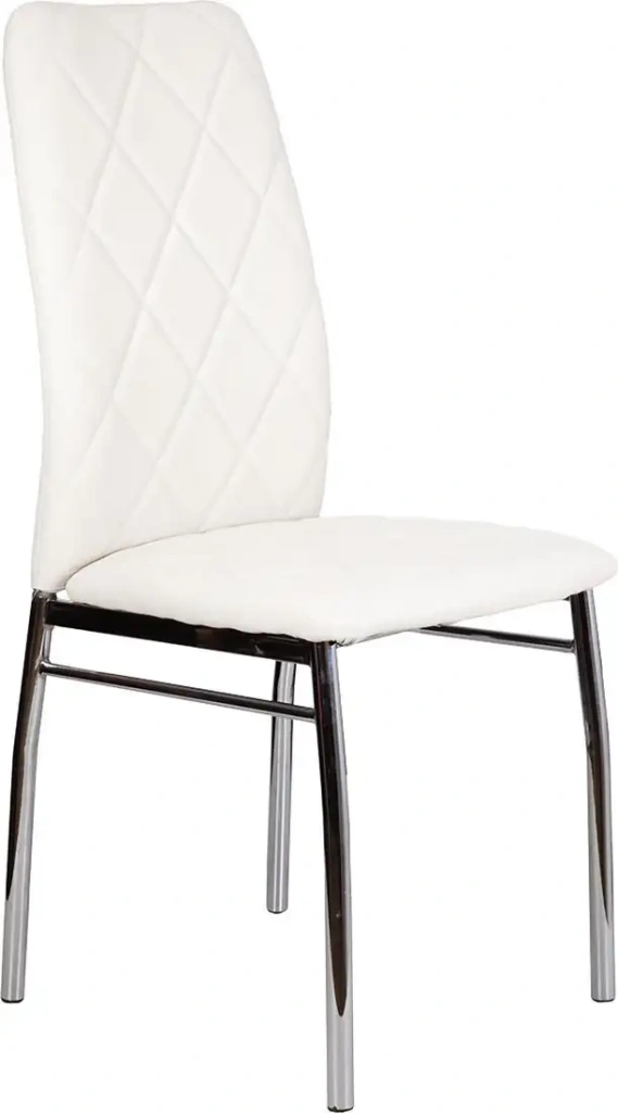 Стул AksHome Adele имеет современный дизайн и идеально подходит для интерьера. Он сделан из прочного металла и обтянут искусственной кожей, что обеспечивает комфорт и долговечность. Стул не складывается и не вращается, его легко разместить в любом помещении. Максимальная нагрузка составляет 120 кг, что подходит для большинства пользователей. Высота сиденья 46 см, а общая высота — 97 см, что позволяет удобно сидеть за столом. Белый цвет и хромированный каркас делают стул стильным и современным. Такой дизайн подойдет как для кухни, так и для офиса. Простая конструкция обеспечивает устойчивость и лёгкость в уходе.