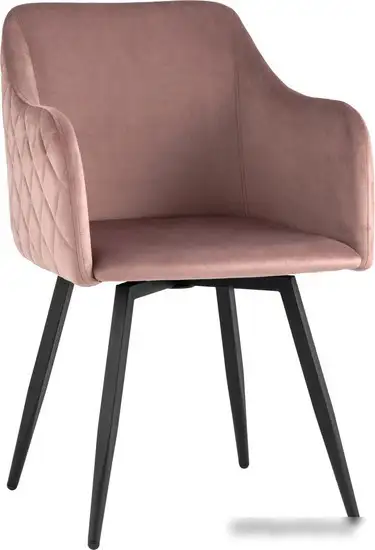 Этот мягкий стул с округлой анатомической спинкой и удобными подлокотниками подарит вам комфорт во время отдыха или работы. Обивка выполнена из прочного и приятного на ощупь велюра пыльно-розового цвета, который легко выдерживает износ. Спинка и подлокотники украшены декоративной строчкой в виде ромбов, придающей стильный вид. Прочные черные металлические ножки обеспечивают стабильность и долговечность. Благодаря функции вращения сиденья, вы легко можете менять положение и достигать нужных предметов. Этот стул отлично подойдет как самостоятельное решение, так и в комплекте с обеденным или письменным столом. Его современный дизайн гармонично сочетается с разными интерьерами. Стул идеально подходит для тех, кто ценит комфорт и яркий стиль.