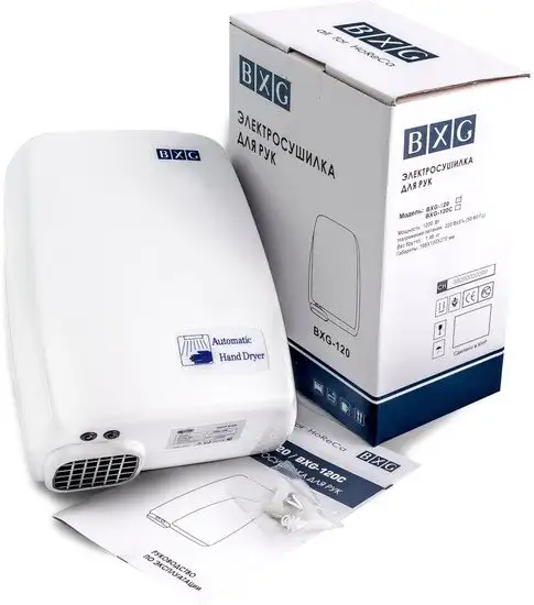Сушилка для рук BXG 120 быстро и удобно высушит руки всего за 20 секунд, благодаря мощной скорости воздуха 16 м/с и температуре до 54°C. Она работает бесконтактно, что делает процесс гигиеничным и безопасным. Корпус из пластика выглядит современно и легко очищается. Устройство оснащено функцией защиты от перегрева, что обеспечивает надежную работу. Уровень шума составляет всего 50 дБ, что делает использование комфортным. Сушилка обладает классом защиты IPX1, что говорит о её влагозащищенности. Размеры (19,5 × 13 × 27 см) позволяют легко разместить её в любой ванной комнате. Вес всего 1,22 кг делает её лёгкой и удобной для установки и перемещения. Код управления — бесконтактное включение, что исключает необходимость касания. Также устройство обладает максимальной температурой воздуха 54°C, что обеспечивает эффективную сушку без излишнего нагрева.