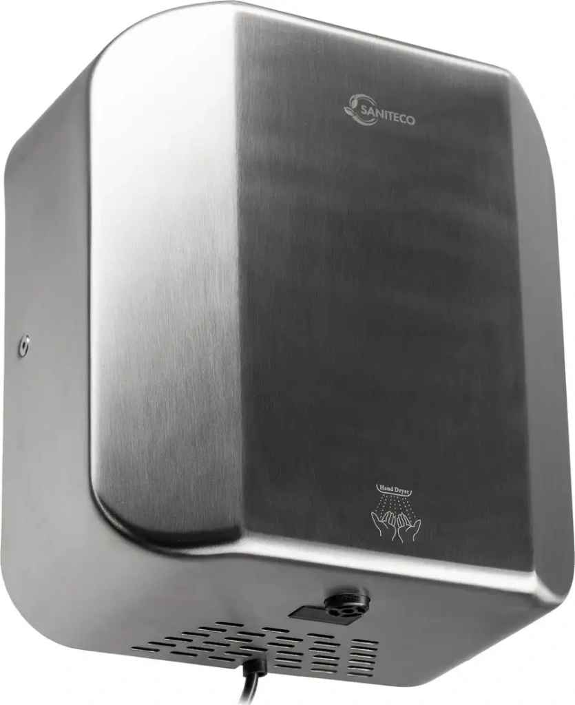 Сушилка для рук Saniteco M-9898 имеет мощность 1200 Вт, что обеспечивает быструю сушку за 60 секунд. Она автоматически включается при приближении руки, что делает использование удобным и гигиеничным. Благодаря скорости воздуха 29 м/с, устройство быстро удаляет влагу с рук. Металлический корпус делает её прочной и долговечной. Максимальная температура воздуха достигaет 75°C, что помогает эффективно высушить руки без перегрева. Устройство обладает классом защиты IPX1, он защищает от небольших капель воды. Размеры сушилки делают её компактной — ширина 21 см, глубина 36,5 см и высота 33 см, весит всего 3,7 кг. Чистый хромированный цвет придает современный вид. Встроенные функции обеспечивают быструю и гигиеничную сушку рук без лишнего ожидания.