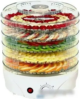 Сушилка для овощей и фруктов Аксион Т-33 имеет мощность 190 Вт и пять уровней для удобной сушки. Она выполнена из прочного белого пластика и подходит для повторного использования благодаря прочному материалу секций. Регулируемый термостат позволяет выбрать температуру сушки в диапазоне от 40 до 70 °C, что помогает сохранить вкус и полезные свойства продуктов. Корпус сушилки небольшой — около 32 см в длину и ширину, и её легко разместить на кухне. Эта модель не имеет таймера или цифровых индикаторов, управление механическое. Устройство отлично подходит для тех, кто хочет сушить фрукты и овощи без лишних функций и с простым управлением.