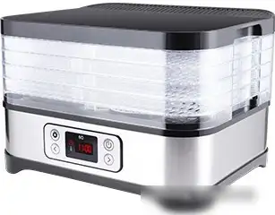 Сушилка для овощей и фруктов BQ FD1001 работает с мощностью 250 Вт и использует конвективный способ сушки. Она оснащена 5 уровнями, между которыми расстояние составляет от 20 до 32 мм, что позволяет сушить разные продукты одновременно. Термостат регулируется в диапазоне от 35 до 70 °C, а температура отображается на цифровом дисплее. Таймер можно установить до 72 часов, чтобы процесс сушки был автоматическим. Корпус сделан из прочного пластика и нержавеющей стали, а управление — электронное. Эта модель компактна и легка — она весит всего 2,54 кг и легко помещается в кухонном пространстве.