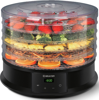 Сушилка для овощей и фруктов Brayer BR1902 мощностью 250 Вт отлично подходит для сушки разных продуктов. Она работает по конвективной технологии и включает 5 уровней, что позволяет сушить много овощей и фруктов одновременно. Расстояние между уровнями составляет 20 мм, что обеспечивает хорошую циркуляцию воздуха. Корпус сделан из прочного пластика черного цвета. Устройство регулируется по температуре от 40 до 70 °C и имеет электронное управление с цифровой индикацией. Таймер можно настроить на 1-48 часов, что удобно для точного контроля процесса. Это делает сушилку простым и полезным помощником для приготовления сухофруктов и овощных закусок.