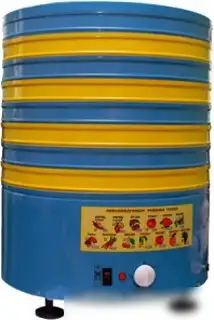 Сушилка для овощей и фруктов Элвин СУ-1У обладает мощностью 1200 Вт и 8 уровнями для одновременного сушки разных продуктов. Ее корпус сделан из окрашенной стали и доступен в синим или желтом цвете, что придает ей современный вид. Объем камеры составляет 60 литров, что позволяет сушить большие порции за один раз. Температура сушки регулируется до 80°C, а наличие механического управления делает работу простой и надежной. Устройство не имеет таймера и индикации температуры, поэтому сжат контроль температуры осуществляется вручную. Размеры сушилки: 48x48x65 см, вес 14 кг, она легка в использовании и легко размещается на кухне. Модель идеально подходит для тех, кто любит сушить овощи и фрукты дома без лишних хлопот.