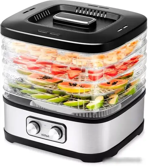 Китфорт KT-1940 — это компактный и удобный конвекционный сушильный аппарат мощностью 240 Вт. Он оснащен 5 уровнями для наилучшей циркуляции воздуха и регулируемым термостатом с диапазоном температур от 35 до 70 °C, что позволяет точно настроить процесс сушки. Корпус сделан из пластика и нержавеющей стали, что обеспечивает прочность и современный внешний вид. Размеры устройства небольшие — чуть более 24 см в длину и ширину —, а вес всего 2,1 кг, что позволяет легко его хранить и переносить. Управление механическое, без электронных дисплеев, что делает устройство простым и удобным в использовании. Также в комплект не входит лоток для пастилы, а материал секции для сушки — пластик. Этот прибор отлично подойдет для сушки фруктов, ягод и трав, обеспечивая простоту и эффективность в домашних условиях.