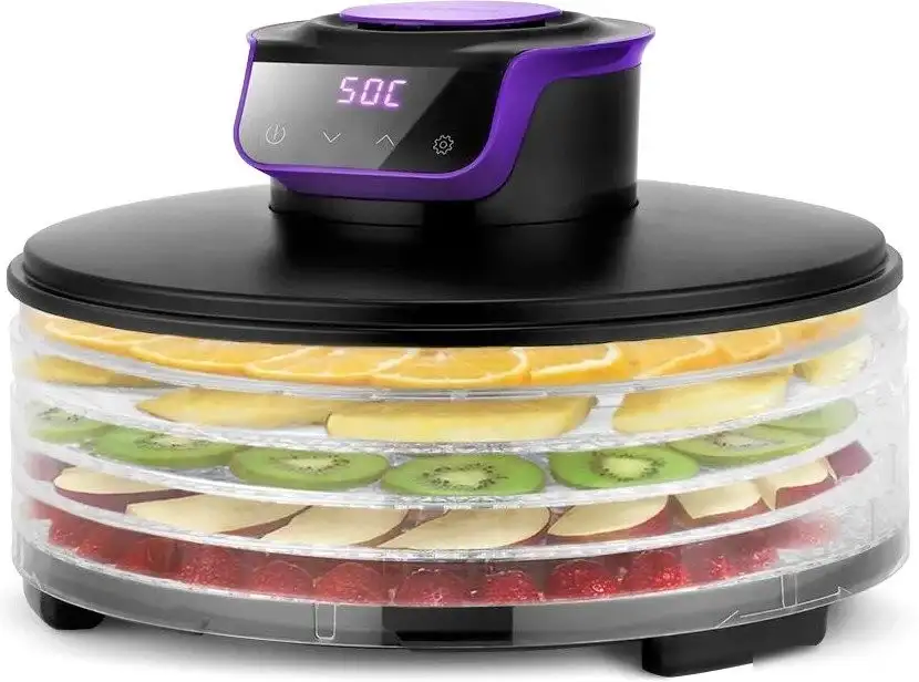 Сушилка для овощей и фруктов Kitfort KT-1996 помогает быстро и легко высушить продукты дома. Она оснащена пятью уровнями, что позволяет готовить сразу большое количество продуктов. Верхний нагревательный элемент равномерно распределяет тепло, а цифровой сенсорный дисплей и индикация температуры делают управление простым и удобным. Регулируемый термостат в диапазоне 35-70°C обеспечивает оптимальные условия для сушки разных продуктов. В комплект входят пять поддонов, сетки для мелких продуктов и поддоны для пастилы, что расширяет возможности использования. Устройство легко управляется с помощью сенсорных кнопок, а таймер поможет завершить работу вовремя. Корпус изготовлен из прочного пластика фиолетового и черного цвета, а его размеры позволяют удобно хранить сушилку дома. Лёгкая конструкция весом всего 1.93 кг делает устройство удобным для перемещения. Эта сушилка идеально подойдет для тех, кто хочет сохранять свои овощи и фрукты на долгое время.