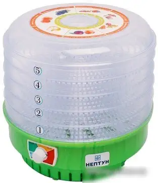 Сушилка для овощей и фруктов Нептун - 5 имеет мощность 660 Вт, что обеспечивает быструю сушку. Она состоит из 5 уровней с общим объемом 23 литра и выполнена из прочного пластика. Корпус выполнен в зеленом цвете и легко помещается в любом помещении. Устройство регулирует температуру сушки в диапазоне от 30 до 70 °C, что позволяет выбрать подходящие условия для разных продуктов. Управление механическое, что делает его простым и надежным. На устройствах отсутствует таймер и индикация температуры, что требует внимательности при использовании. Каждый уровень секции для сушки выполнен из пластика, что облегчает очистку. Размеры сушилки — 327x327x355 мм, весит она 6 кг, что удобно для переноски и хранения. Эта модель идеально подходит для тех, кто хочет легко и быстро сушить овощи и фрукты дома.