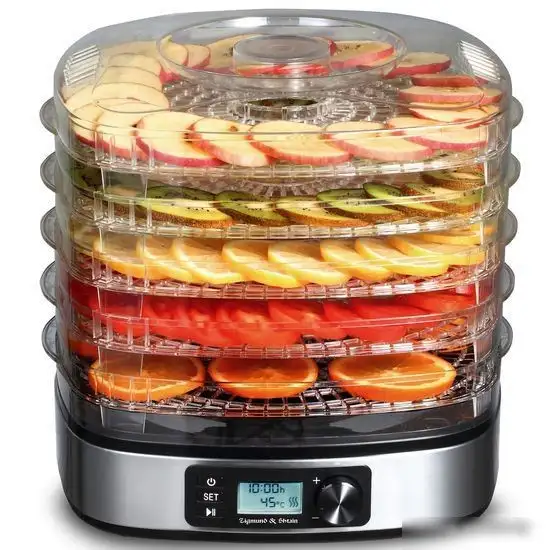 Сушилка для овощей и фруктов Zigmund & Shtain ZFD-410 мощностью 400 Вт идеально подходит для сушки овощей, фруктов и трав. Она оснащена 5 уровнями для равномерной сушки и обладает регулируемым термостатом, что позволяет выбрать температуру от 37 до 75 °C. Корпус сделан из прочной нержавеющей стали, а секции для сушки выполнены из пластика. В устройстве есть цифровая индикация температуры и электронное управление, что облегчает настройку сушилки. Таймер помогает установить время сушки, чтобы продукты были правильно подготовлены. Компактные размеры позволяют легко разместить сушилку дома, а небольшой вес делает её удобной в использовании.
