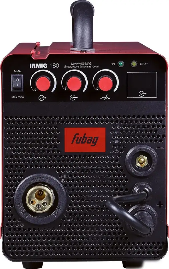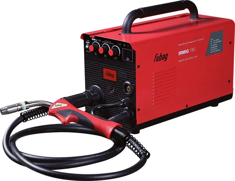 Этот сварочный инвертор Fubag IRMIG 180 подходит для ручной дуговой сварки и полуавтоматической сварки с проволокой. Он работает при напряжении 230 В и может выдавать ток от 30 до 180 А, что позволяет выполнять разные виды сварочных работ. Мощность прибора составляет 7 кВт, а продолжительность нагрузки — 25 %, что обеспечивает стабильную работу. Устройство компактное и лёгкое, его размеры — 440 на 205 на 270 мм, а вес — всего 8,8 кг. В комплект входит горелка длиной 3 м, кабели, газовый шланг и ролик для подачи проволоки.