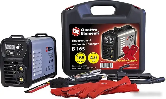 Сварочный инвертор Quattro Elementi B 165 предназначен для ручной дуговой сварки (MMA). Он работает в сетях с пониженным напряжением, что обеспечивает стабильную работу в разных условиях. Максимальный сварочный ток составляет 165 А, а мощность достигает 4,9 кВт для быстрого и качественного выполнения сварочных работ. Инвертор имеет продолжительность нагрузки 80%, что позволяет работать длительное время без перегрева. Он легко запускается благодаря функции горячего старта и позволяет быстро зажечь дугу с помощью форсажа дуги. Функция антизалипания помогает избегать застревания электрода, что облегчает работу для новичков. Компактный и легкий (вес 3,4 кг) агрегат удобно переносить и использовать на стройке или в мастерской. В комплект входят сварочные краги, электроды, кейс, наплечный ремень, электродержатель и провода разной длины, а также сварочные перчатки. Эта модель сочетает простоту в использовании и надежность для разных сварочных задач.