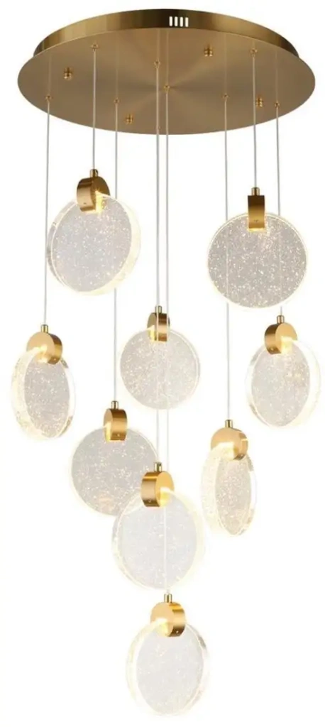Подвесная люстра Aployt Frederik создает яркое освещение благодаря девяти встроенным светодиодам мощностью 45 Вт каждая. Она легко управляется дистанционным пультом и не требует регулировки яркости или поворотных ламп. Каркас выполнен из металла и стекла в золотистом и прозрачном цвете, что придает ей современный стиль. Люстра имеет длину и ширину по 50 см и высоту 200 см, что хорошо подходит для просторных помещений. Световая отдача составляет 2475 люмен, а цветовая температура — 3000 K, создавая теплую атмосферу. Вес конструкции — 14,5 кг, что обеспечивает прочность и надежность при установке. В комплект входит лампочка, что ускоряет монтаж. Благодаря светодиодной подсветке в желтом цвете она создаёт уютное освещение и экономит электроэнергию.