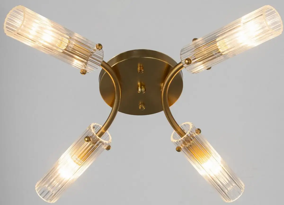 Люстра BayerLux Рико имеет классический дизайн и подходит для установки на потолок. Она оснащена четырьмя держателями под лампы с цоколем E27, каждая мощностью 60 Вт. Каркас выполнен из металла в бронзовом цвете, а плафоны изготовлены из прозрачного стекла, что обеспечивает яркое и ровное освещение. Размеры люстры — длина 40 см и ширина 46 см, а высота — 18 см. Вес конструкции составляет 1,6 кг, и крепится она планкой. Встроенных светодиодов нет, и лампы не входят в комплект. Люстра не обладает функциями поворота или подсветки, а также не имеет дистанционного управления.