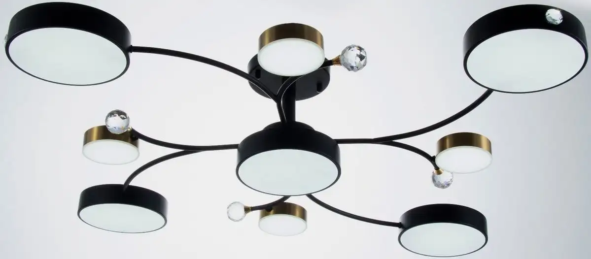 - Современный дизайн с черным каркасом и белыми плафонами — легко сочетается с интерьером.