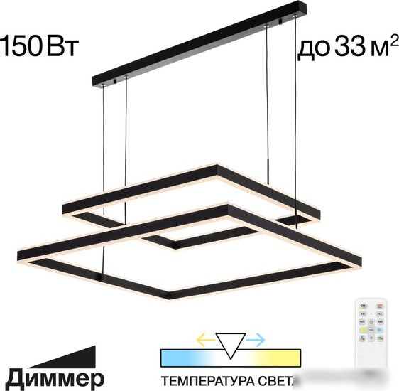 Припотолочная люстра Citilux Дуэт CL719K211 имеет современные дизайн и материал — металлический каркас, который придает ей стильный вид. Она крепится на потолке с помощью планки, занимает площадь 88х89 см, а её высота составляет 120 см. Люстра весит 4,9 кг, что обеспечивает её стабильность и лёгкую установку. Благодаря световому потоку в 12000 люмен, она хорошо освещает комнату. Цветовую температуру можно регулировать от 3000 до 5500 К, создавая нужное настроение. Люстра подходит для зонирования пространства и подчеркивает современный дизайн интерьера. Однако она не обладает повышенной влагозащищённостью, поэтому устанавливайте её в сухих помещениях.