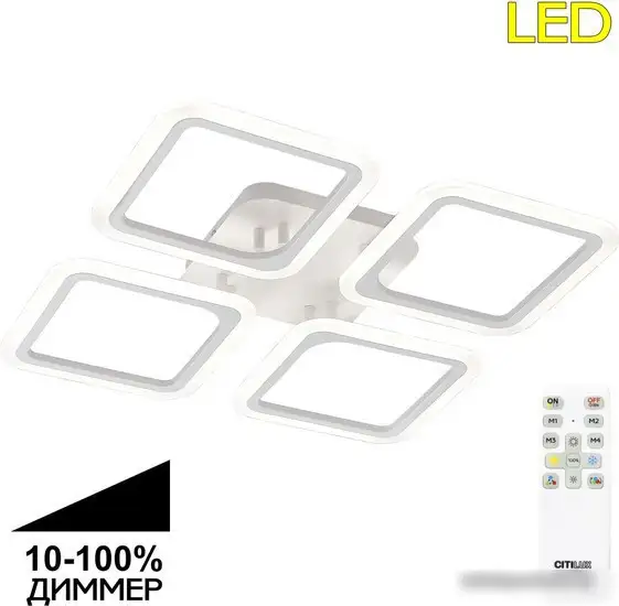 Припотолочная люстра Citilux Марсель CL232140R выполнена в современном стиле и отлично подходит для любого интерьера. Она оснащена четырьмя светодиодными лампами мощностью 17 Вт каждая, которые обеспечивают яркий свет с общим потоком 7000 люмен. Благодаря встроенным светодиодам лампы не требуют частой замены и работают долго. Люстра позволяет регулировать цветовую температуру в диапазоне от 3000 до 5500 K, что помогает создать комфортную атмосферу. Управление осуществляется дистанционно, в комплект входит пульт, что удобно и быстро. Каркас и плафоны выполнены из прочных материалов — металла и пластика, что делает конструкцию надежной. Размеры люстры — 60x60 см, высота — 8 см, вес — 2,35 кг. Регулировка цветовой температуры позволяет менять настроение комнаты. Этот светильник легко монтировать на потолок с помощью планки и он будет долго радовать ярким светом.