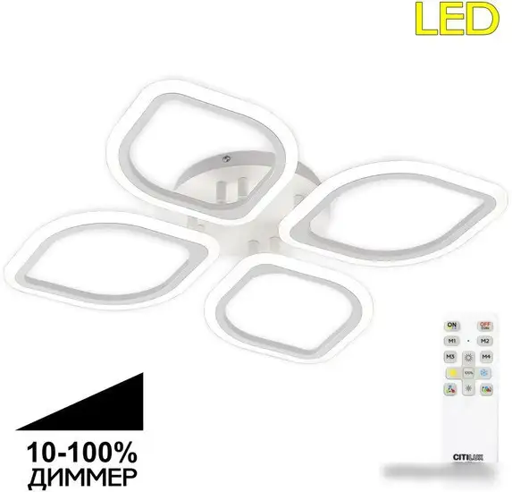Припотолочная люстра Citilux Ромби CL236140R отлично подходит для освещения вашей комнаты. Она имеет белый каркас из металла и светлые плафоны из пластика, создавая современный и чистый внешний вид. Люстра оснащена четырьмя светодиодными лампами мощностью 64 Вт, которые обеспечивают яркий свет с общим потоком 6400 люмен. Вы можете регулировать яркость и цветовую температуру от 3000 до 5500 K, чтобы создать нужную атмосферу. Управление осуществляется дистанционно, что удобно и быстро. Размер конструкции — длиной и шириной 51 см, а высота всего 11 см, что позволяет легко разместить её в большинстве помещений. Ее дизайн прост и современен, а крепление планка обеспечивает надежную установку. Люстра не имеет выключателя, что предполагает управление через дистанцию. Такие особенности делают эту люстру удобной и функциональной для дома или офиса.