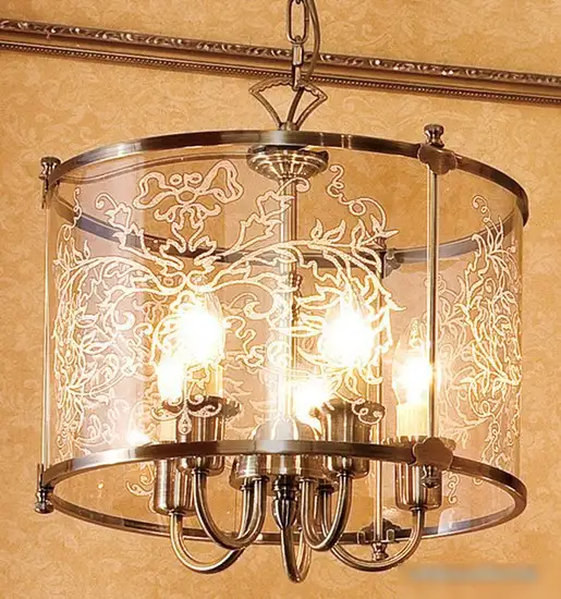 люстра, 5×60 Вт, плафон рисунок/прозрачный, каркас бронзовый