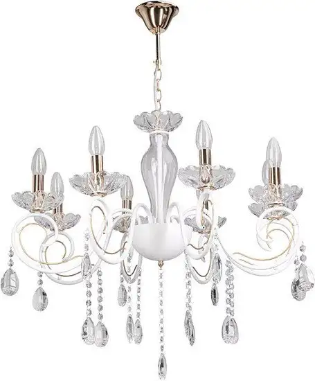 Припотолочная люстра De Markt Свеча 683015008 выполнена из металла с белым покрытием и элементами в цвете золота. Она украшена декоративными прозрачными стеклянными розетками и центральной осью, а также подвесками из прозрачного хрусталя, которые красиво преломляют свет. Тонкие изогнутые рожки создают эффект оригинальных завитков и добавляют изящества. Люстра не имеет традиционных плафонов — вместо них используются лампы накаливания, имитирующие огонь свечи. Благодаря регулировке высоты её можно настроить под любое пространство и удобство. Заменяемые лампы делают обслуживание простым и удобным. Белый и золотой цвет создают торжественную атмосферу, а минимализм дает ощущение легкости и свободы. Каркас изготовлен из прочного металла, а стеклянные элементы — ручной работы, что придает уникальность каждой модели.