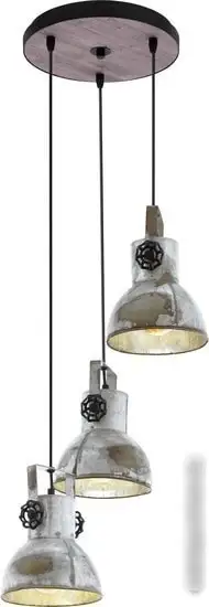 Люстра Eglo Barnstaple 49647 — это классическая потолочная модель с тремя лампами мощностью по 40 Вт. Она имеет серые стеклянные плафоны и коричневый металлический каркас, что создаёт уютную атмосферу в комнате. Высота её составляет 150 см, что позволяет хорошо освещать просторные помещения. Усугубляет простота установки крепление на планке. Люстра не оснащена регулятором яркости или пультом, поэтому свет регулируется только при смене ламп. Благодаря прочным материалам она долговечна и легко вписывается в разные интерьеры. Этот светильник идеально подходит для гостиных или спален с классическим стилем. Он не обладает влагозащитой или дополнительными функциями, что делает его подходящим преимущественно для сухих помещений.
