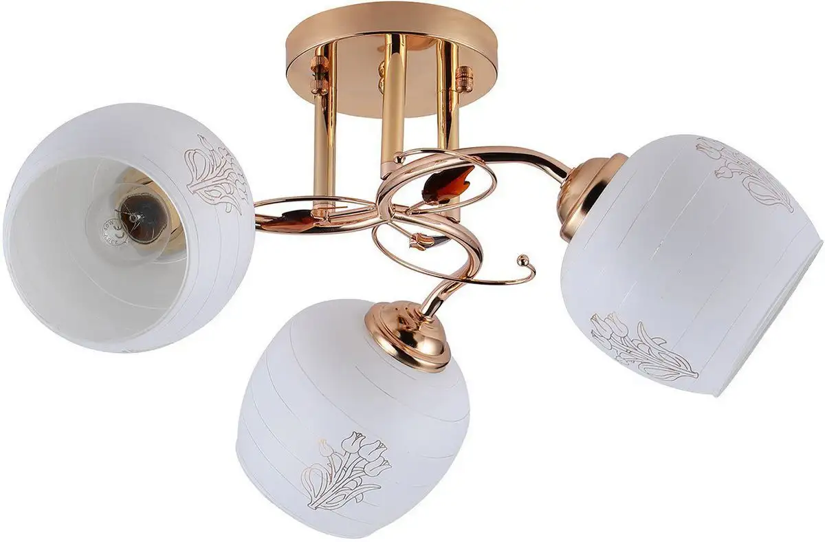 люстра средней высоты, плафон белый/рисунок (стекло), каркас золотистый