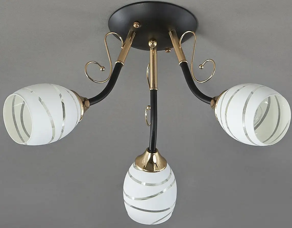 люстра средней высоты, плафон белый/рисунок (стекло), каркас черный/золотистый