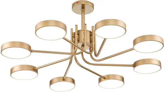Люстра средней высоты Escada Skylar 10258/8 LED в стиле Champagne gold отлично подходит для потолка. Она оснащена встроенными светодиодами мощностью 70 Вт, которые обеспечивают яркий свет с потоковой характеристикой 9600 люмен. Размеры люстры: длина и ширина по 68 см, высота 28 см, она легко крепится на планку. Каркас сделан из металла, а плафон — из металла и акрила, что придает изделию современный и элегантный вид. Люстра не имеет регулировки яркости и цвета свечения, но обеспечивает стабильное освещение. Она не поддерживает дистанционное управление или интеграцию с "умным домом". В комплект входит светильник, монтажный комплект, инструкция и пульт для удобства. Благодаря простому дизайну и качественным материалам, эта люстра отлично подойдет для гостиной или кухни.