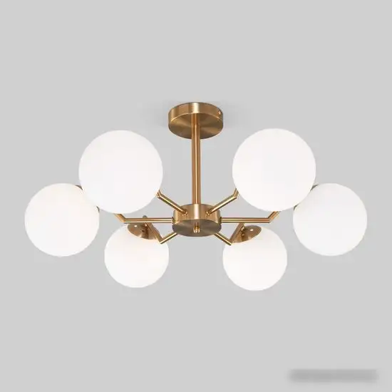 Эта люстра среднего размера отлично подходит для светлого и современного интерьера. Она легко устанавливается на потолке и украшает комнату с помощью шести ламп мощностью по 60 Вт. Белые плафоны из стекла создают мягкое и равномерное освещение, а латунный каркас добавляет изделию стильный вид. Размеры люстры составляют 72 см по длине и ширине, а высота — 31,4 см. Она подходит к разным помещениям благодаря универсальному дизайну. Люстра отличается прочностью благодаря металлическому каркасу и стеклянным плафонам. Благодаря цоколю E27 ее удобно заменять и обновлять лампы. Простая конструкция позволяет быстро монтировать устройство. Эта модель сделана из качественных материалов, что обеспечивает долговечность и надежность освещения.