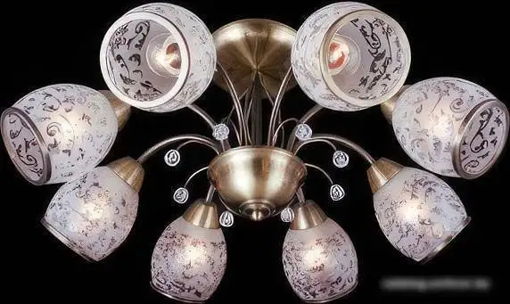 люстра средней высоты, плафон белый/рисунок/прозрачный (стекло/хрусталь), каркас бронзовый