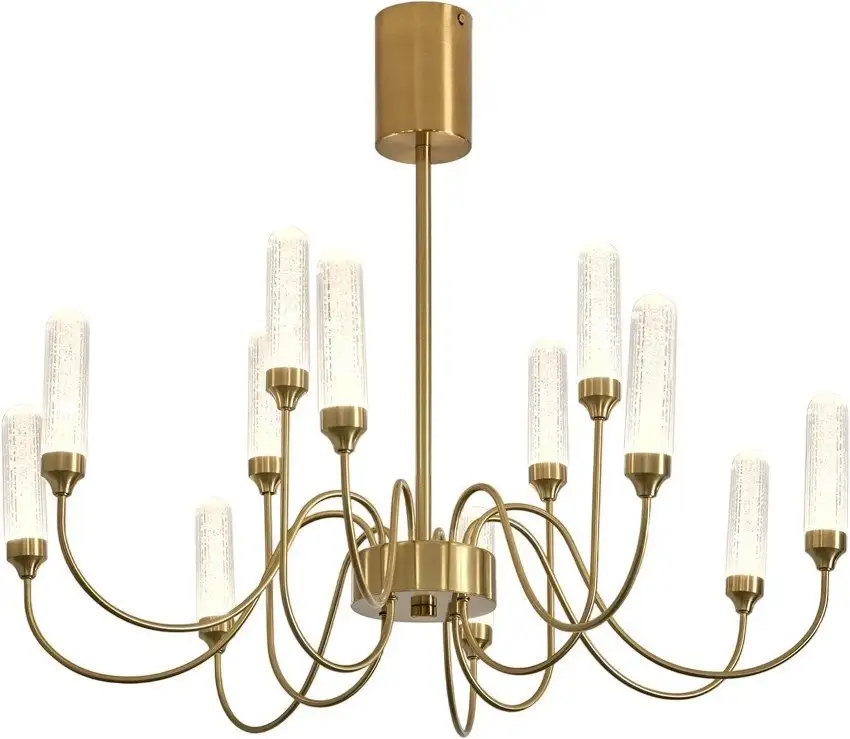 Подвесная люстра Freya Alias FR2050CL-L36BS крепится к потолку и имеет современный дизайн. Она оснащена 12 светодиодными лампами мощностью 31 Вт каждая, что обеспечивает яркий свет с потоком 2500 люмен. Каркас выполнен из прочного металла в золотистом цвете, а плафоны сделаны из прозрачного акрила, что создает приятное рассеянное освещение. Размеры люстры — 60 см в длину и ширину, а высота 50 см позволяют хорошо освещать просторное пространство. Устройство не имеет дистанционного управления и регулировки яркости, однако оно легко подключается к большинству потолочных монтажных систем. Благодаря использованию светодиодов, люстра отличается низким энергопотреблением и долгим сроком службы. Простота установки и современный дизайн делают этот светильник подходящим для гостиной, кухни или столовой. Она не поддерживает интеграцию в "умный дом" и функции регулировки цвета или температуры. Вес люстры составляет чуть менее 2 кг, что облегчает монтаж и обеспечивает стабильность.