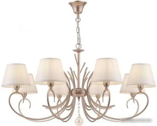 Подвесная люстра Freya Gisela FR2013PL-08G имеет восемь ламп с мощностью по 40 Вт, которые создают яркое освещение. Каркас выполнен из металла золотистого цвета, а плафоны из белого текстиля придают дизайну классический вид. Люстра длиной и шириной по 89 см висит на крюке и весит всего 4 кг. Она не управляется дистанционно и не имеет выключателя, поэтому включение осуществляется вручную. Светильник не регулирует яркость и цветовую температуру, поэтому свет остается постоянным. Благодаря прочной конструкции, люстра хорошо подходит для большой комнаты или прихожей.