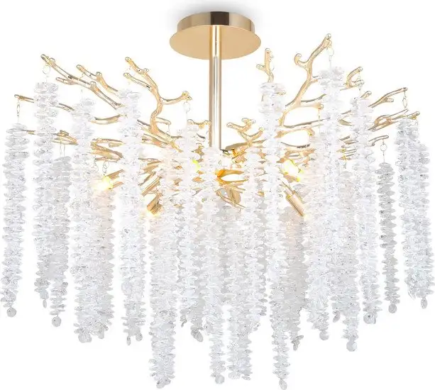 Подвесная люстра Freya Mineral FR1010CL-08G выполнена в современном стиле с растительным мотивом. Каркас изготовлен из металла, покрытого золотистой краской, а декоративные элементы в виде капелек создают красивые световые переливы. Люстра оснащена восемью лампами с цоколем G9 и мощностью по 40 Вт каждая, которые позволяют ярко освещать пространство. Поворотные лампы отсутствуют, свет регулируется через выбранные лампы. Она крепится к потолку с помощью планки и имеет ширину 60 см и высоту 52 см. Люстра легко установить и она весит около 8.7 кг. Главное её достоинство — стильный дизайн и эффектные хрустальные детали.