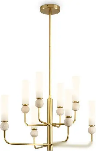 Подвесная люстра Freya Sunspot FR5482CL-08BS создаёт яркое и приятное освещение благодаря восьми лампам мощностью 25 Вт каждая. Каркас выполнен из металла и искусственного камня в золотистом цвете, а плафоны из стекла с белым оттенком придают интерьеру современный стиль. Размеры люстры — 45x45 см, высота 84,5 см, она весит около 3 кг и легко крепится на потолок при помощи планки. Люстра не имеет встроенных светодиодов, а основные лампы используют цоколь G9, что позволяет выбрать подходящие лампы по своему вкусу. Несмотря на отсутствие функции регулировки яркости и цвета, она обеспечивает стабильное и яркое освещение. Кнопки выключателя, дистанционного управления и интеграции в "умный дом" у неё нет, что делает управление простым и удобным. Эту модель стоит установить в гостиной, столовой или коридоре для стильного и практичного освещения.