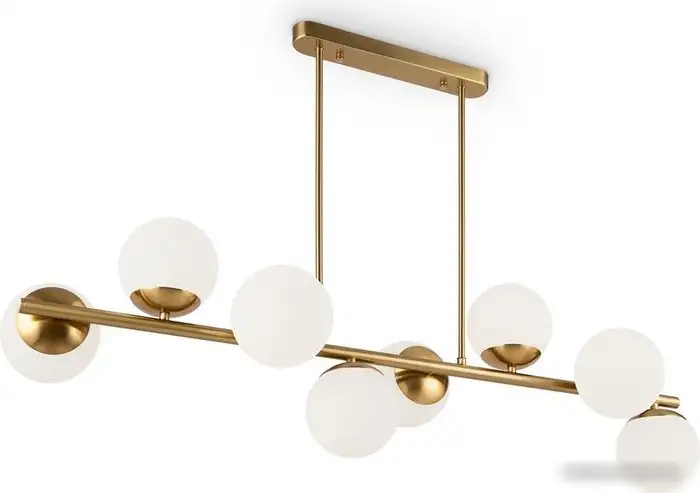 Подвесная люстра Freya Zing FR5199PL-08BS отличается современным минималистичным дизайном с простыми геометричными формами. Ее металлический каркас в цвете латуни или черном дополняют округлые матовые стеклянные плафоны белого цвета, которые создают мягкое и приятное освещение. Люстра оснащена восемью лампами с цоколем E27, каждая мощностью 60 Вт, что обеспечивает яркое и равномерное освещение. Она имеет компактные размеры — длину 104 см, ширину 13 см и высоту 70,2 см, что делает её универсальной для кухни, гостиной или спальни. Горизонтальная планка помогает легко корректировать параметры светильника, делая установку быстрой и удобной. Конструкция выглядит легкой и аккуратной благодаря продуманной геометрии и сдержанным линиям. Люстра подходит для интерьеров в стиле лофт, минимализм, хай-тек и сканди. Она не защищена от влаги, поэтому лучше устанавливать в сухих помещениях. Этот светильник сочетает в себе стиль и практичность для современного дома.