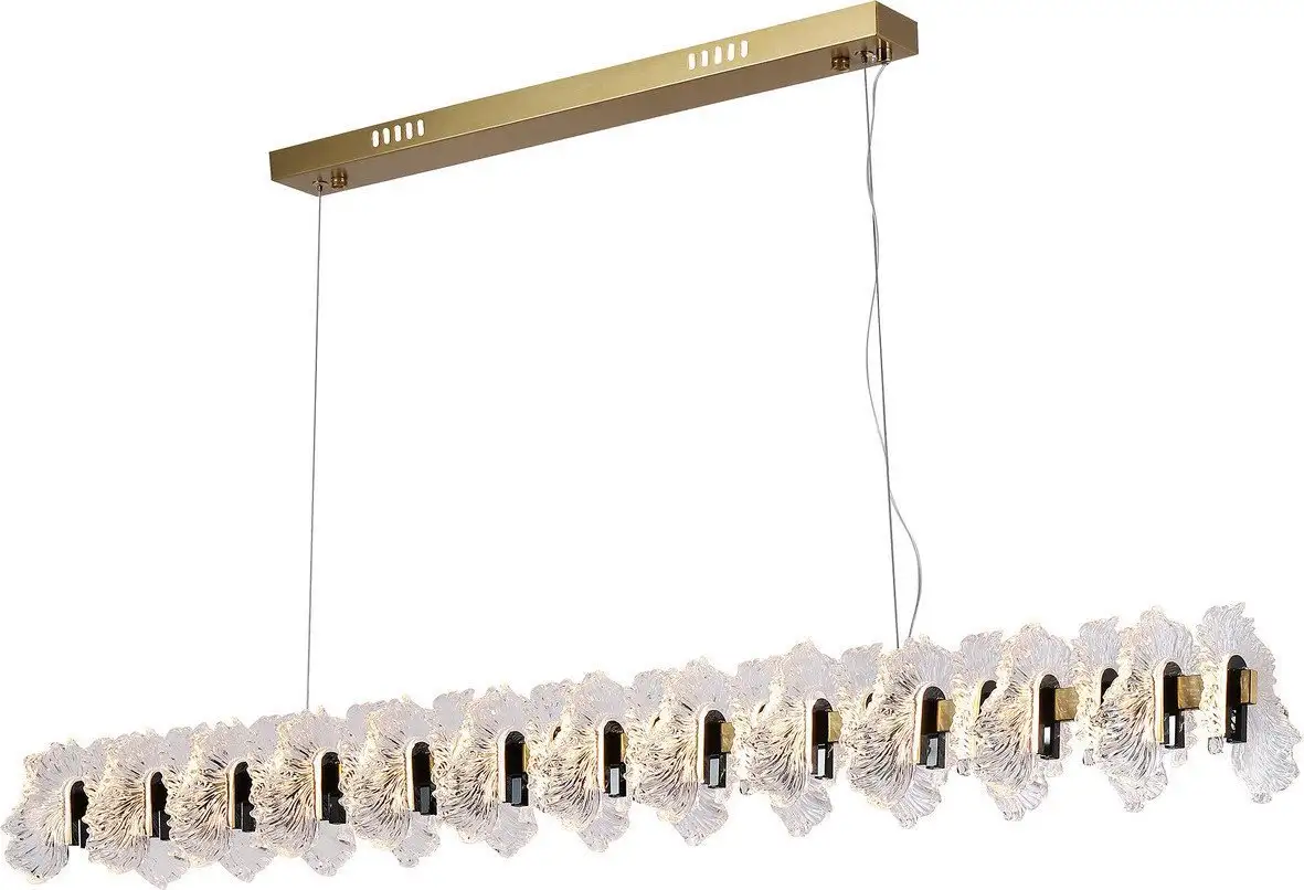 Подвесная люстра Kinklight Мару 07695-120L.36-29 отлично подходит для современных интерьеров. Она имеет один светильник с встроенными светодиодами мощностью 40 Вт, который обеспечивает яркое освещение — 4480 люмен. Каркас выполнен из металла с золотистым покрытием и есть прозрачные плафоны из стекла, создающие приятный свет. Люстра длиной 120 см и высотой 200 см легко повесить на потолок и она отлично подойдет для комнаты среднего размера. В комплект входит лампа, что удобно сразу начать использовать. Управление отсутствует, свет регулируется аппаратно с помощью включения и выключения. Светодиоды работают при температуре 3000K, создавая мягкий теплый свет. Она не имеет функций "умного дома" или регулировки яркости, что делает ее простым и надежным решением. Эта модель легко монтируется на планку и весит всего 9 кг, что облегчает установку.