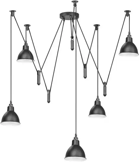 - Черный каркас и плафоны — универсальный дизайн, сочетается с разными стилями интерьера.