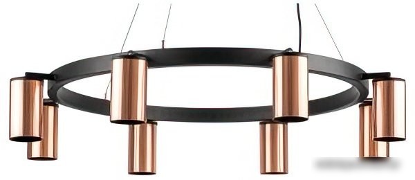 Подвесная люстра Lightstar Rullo LR018308 имеет современный дизайн и красиво сочетается с любым интерьером. Она располагается на потолке и включает восемь ламп с мощностью по 400 Вт каждая, что обеспечивает хорошее освещение комнаты. Каркас и плафоны сделаны из металла, что обеспечивает прочность и долговечность. Цвет каркаса — черный, а плафоны — медные, что придает изделию стильный вид. Люстра крепится на планку, что позволяет удобно установить её на потолке. Размеры — ширина 93 см и высота 125 см. Используются цоколи GU10, лампочки в комплект не входят. Этот светильник отлично подойдет для просторных комнат, создавая яркое и равномерное освещение.