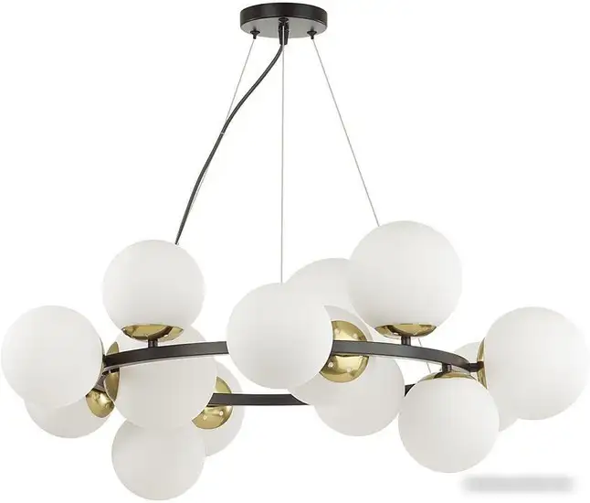 Люстра Lumion Melona 6508/14 отлично подойдет для домашнего интерьера, создавая уютную и элегантную атмосферу. Ее черный каркас с бронзовыми декоративными элементами добавляет стиль и старинный шарм. Белые матовые плафоны в форме шара обеспечивают мягкое освещение, которое равномерно освещает пространство. Люстра оснащена 14 лампами мощностью 40 Вт каждая, что позволяет освещать площадь до 28 кв.м. Ее длина и ширина составляют по 80 см, а высота — 122 см, что делает ее подходящей для гостиной, спальни, прихожей или кухни. Люстра устанавливается на потолке и крепится планкой, легко вписываясь в современный дизайн. Материалы — металл и стекло, что обеспечивает надежность и долговечность. В комплекте лампочки не идут, их можно выбрать отдельно в соответствии с нужной яркостью. Она не обладает функциями дистанционного управления или "умного дома", однако отлично сочетает стиль и практичность.