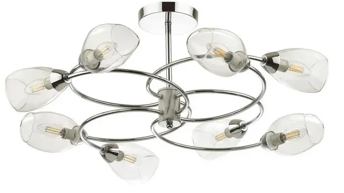 Эта люстра средней высоты отлично подходит для потолков и украшает любой интерьер. Она имеет восемь ярких ламп мощностью 40 Вт каждая, что обеспечивает стабильное освещение. Каркас выполнен из металла, а плафоны из прозрачного стекла, создавая современный и стильный вид. Люстра крепится к потолку планкой и имеет длину и ширину по 76 см, а высота – 31 см. Используйте различные типы ламп: накаливания, люминесцентные, светодиодные или галогенные, чтобы подобрать нужный свет. Обратите внимание, что лампочки в комплект не входят. Люстра не имеет регулировки яркости и поворотных ламп. Она проста в установке и отлично подходит для уютных жилых помещений.