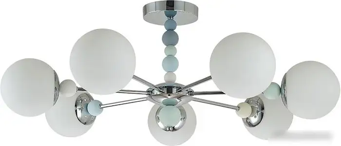 Люстра Lumion Sunday 6525/7C — это потолочное освещение в современном стиле, которое хорошо подойдет для прихожей, кухни, гостиной или спальни с низкими потолками. Она оснащена семью лампами мощностью по 40 Вт, которые обеспечивают яркое освещение площадью до 14 квадратных метров. Каркас выполнен из металла и керамики, а плафоны изготовлены из стекла, что придает изделию современный и прочный вид. Светильник легко крепится на потолок с помощью планки и не имеет встроенного дистанционного управления или интеграции с "умным домом". Он не подходит для помещений с высокими потолками, так как его высота составляет 30 см. Светильник не включает лампочки в комплект, их нужно покупать отдельно по стандартному цоколю E14. Благодаря классическому дизайну и нейтральной цветовой гамме, люстра легко вписывается в разные интерьеры. Эта модель проста в монтаже и весит всего 3 кг, что делает ее удобной для установки.