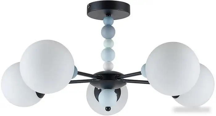 Люстра Lumion Sunday 6526/5C — стильное устройство для освещения помещений до 10 кв.м. Она имеет пять ламп мощностью по 40 Вт, которые создают яркое и равномерное освещение. Плафоны сделаны из матового белого стекла, а каркас украшен керамическим декором голубого или черного цвета, что придает ей современный и элегантный вид. Люстра устанавливается на потолок и подходит для гостиной, кухни, прихожей или спальни с невысокими потолками. Она не оснащена дистанционным управлением или функцией "умный дом". Материалы — керамика, металл и стекло — обеспечивают надежность и долговечность. Благодаря дизайну в стиле Модерн и светопроницаемости, эта люстра создает приятную атмосферу в любой комнате. Её размеры — 65 см в длину и ширину, высота — 30 см, вес — 2 кг. Простая установка и современный дизайн делают её отличным выбором для стильного интерьера.